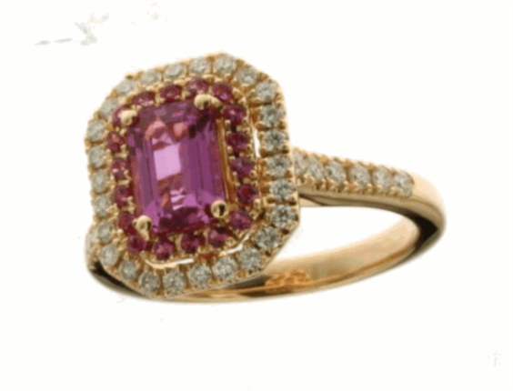 ANELLO OTTAGONALE CON DOPPIO CONTORNO DIAMANTI E ZAFFIRI ROSA E ZAFFIRO ROSA CENTRALE