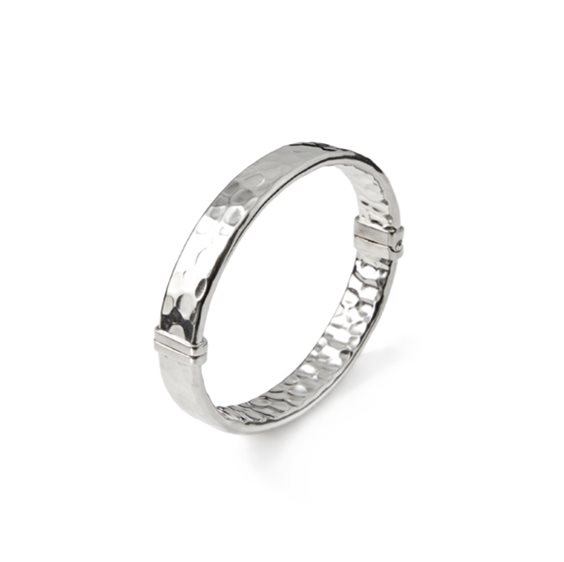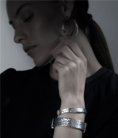 La particolarità dell'argento martellato a mano, l'eleganza delle ampie forme circolari. Semplice e luminosa bellezza d'un gioiello che fa del minimalismo il suo punto di forza. Apertura con molla, misura ovale interno cm.6x5,40.