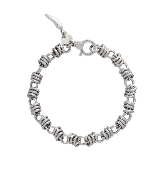 Elegante e luminosissimo. Giovanni Raspini ha utilizzato per il bracciale Vic una particolarissima catena che, ad ogni maglia circolare, ne alterna altre tre poste ortogonalmente. Prodotto in argento martellato, il bracciale riflette la luce con grande intensità plastica. Viene realizzato completamente a mano.
