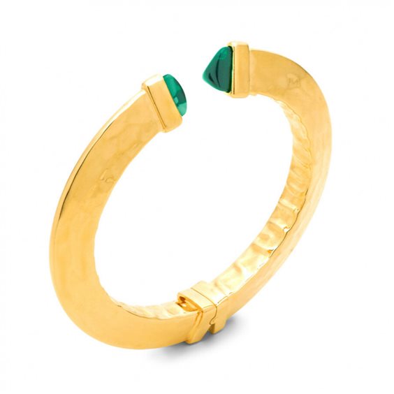 Bracciale in rigido in Argento 925 dorato e cristalli verdi della collezione Rock. Un elegante bangle in argento dorato che si distingue per il sapiente equilibrio di volumi, riflessi e il contrasto cromatico dei cristalli verdi posti alle due estremità. Il bracciale è realizzato con una lastra d'argento, martellata e successivamente piegata a mano. Ideale da indossare abbinato ad altri bangle di diverse dimensioni, rappresenta un accessorio versatile e dallo stile inconfondibile.