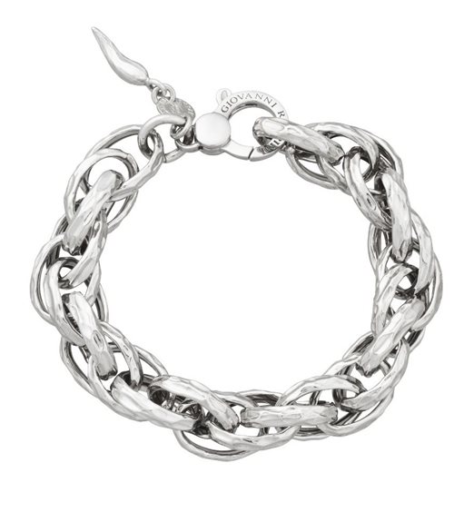 Giovanni Raspini sceglie una catena in argento martellato ad intreccio torchon, e la trasforma in un bracciale raffinato e di grande impatto. L'effetto martellato amplifica la rifrazione della luce, valorizzando l'elegante texture realizzata a mano in azienda. Argento 925 Lunghezza 22 cm Chiusura con moschettone Fatto a mano in Italia