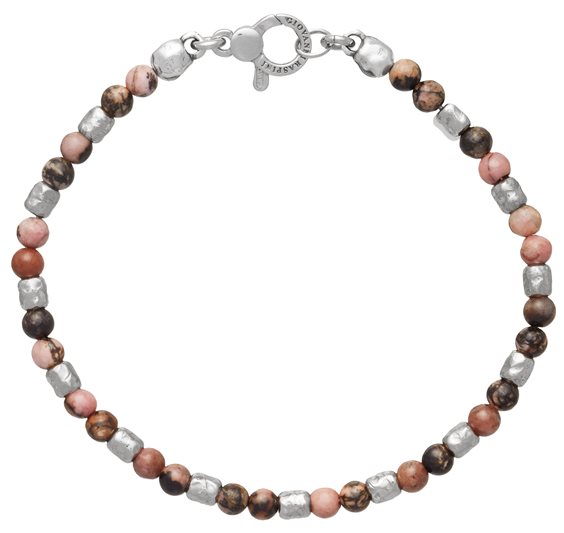 Il mondo è colore. Piccoli e stilosi elementi in argento e sferette in pietra rodonite danno vita a questo bracciale della collezione Tango. Un gioiello minimalista ed elegante, realizzato completamente a mano e perfetto per l'indosso multiplo.