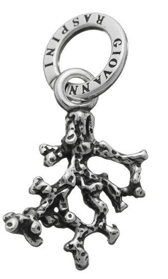 Corallo. Argento che sembra fluire materico, quasi vivo, dagli intrecci dei rami corallini. Altezza cm.2,50 (esclusa maglina con logo cm.0,90).