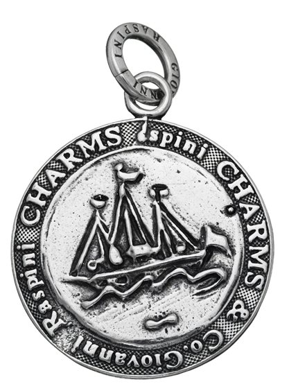 Charm Veliero (bifronte). Il veliero è l’emblema dell’avventura e del coraggio che serve per girare il mondo. Altezza cm.2,50 (esclusa maglina con logo cm.0,90).