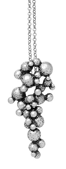 Pendente Bubbles. Questa collana racconta tutto il fascino della fusione a cera persa. Una creazione iconica caratterizzata da sferette "a cascata" in argento brunito ad effetto martellato. Realizzato a mano in azienda.