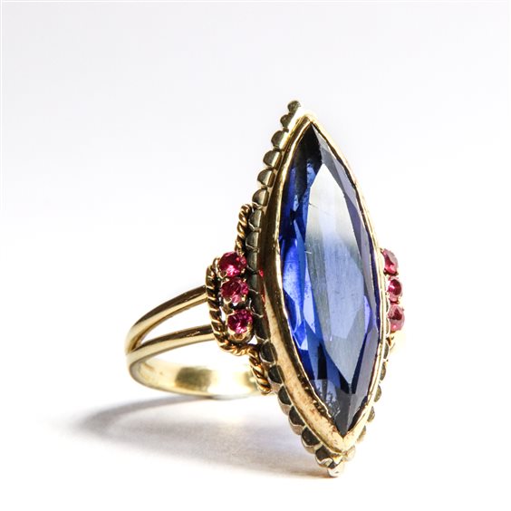 ANELLO EPOCA ANNI '30 ORO GIALLO E BIANCO 18KT ZAFFIRO SINTETICO TAGLIO NAVETTE RUBINI CT 0.30 GR 9 USATO, CONDIZIONI ECCELLENTI
