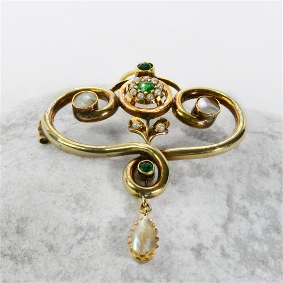 CIONDOLO SPILLA IN ORO GIALLO 14KT GR 5.50 CON SMERALDI CT0.15 E PERLINE. EPOCA FINE 1800 DIM.MM.40X40 OTTIME CONDIZIONI