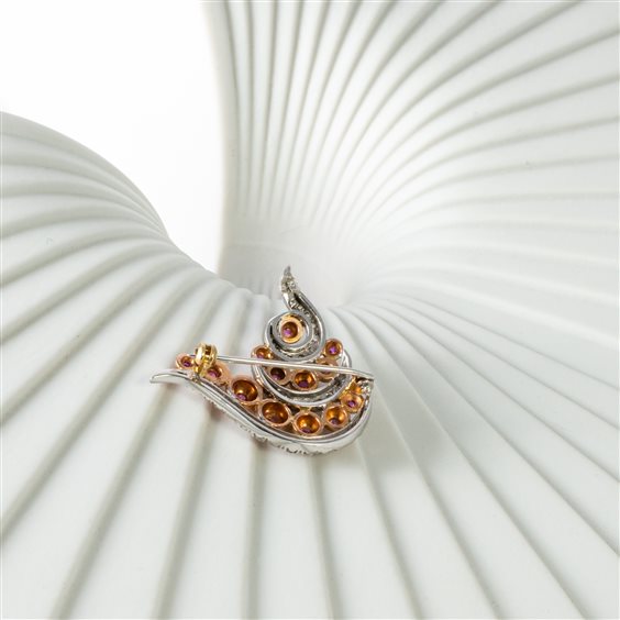 SPILLA EPOCA 1970 IN ORO ROSA E BIANCO 18 KT CON ZAFFIRI ROSA CT 0.60 E ROSETTE DI DIAMANTI PESO GR 8.9 USATO, OTTIME CONDIZIONI