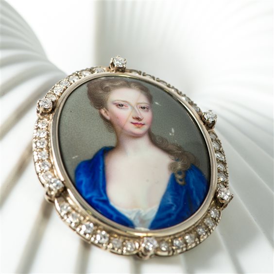SPILLA/CIONDOLO EPOCA INIZIO 1900 IN ORO BIANCO CON MINIATURA SU SMALTO E DIAMANTI A CONTORNO CT 1.70_ PESO GR 18.8_x000D_ USATO, BUONE CONDIZIONI Mis: CM5X4