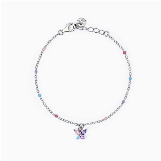 Bracciale regolabile da bambina in argento rodiato con catena forzatina, applicazioni smaltate e ciondolo a forma di farfalla in tormalina sintetica rosa e zirconi multicolor taglio a navette. Misura regolabile, lunghezza da 14.5 a 16.5 cm