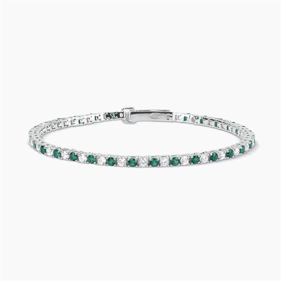 Bracciale tennis in argento 925/°°° rodiato con smeraldi sintetici Ø 2.5 mm e zirconi Ø 2.5 mm, lunghezza 17 cm