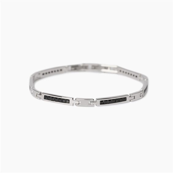 Bracciale con piastre in argento rodiato e zirconi neri. Chiusura in acciaio. • Dimensione elementi: 18x4 e 9,5x4 mm • Dimensione zirconi neri: 2x2 mm • Lunghezza regolabile da 18,5 a 19,5 cm • Materiale: Argento rodiato 925, Zirconi