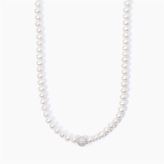 Girocollo in argento 925/°°° rodiato con perle coltivate Ø 4.50-5 mm e sfera di zirconi bianchi, lunghezza regolabile da 38 a 44 cm