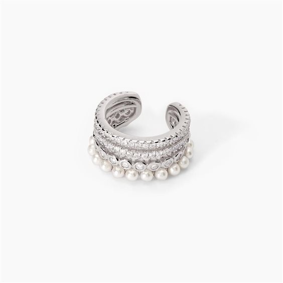 Orecchino ear cuff argento 925/°°° rodiato con zirconi bianchi e imitation pearl Ø 2 mm, apertura 4 mm, Ø 14.50 mm
