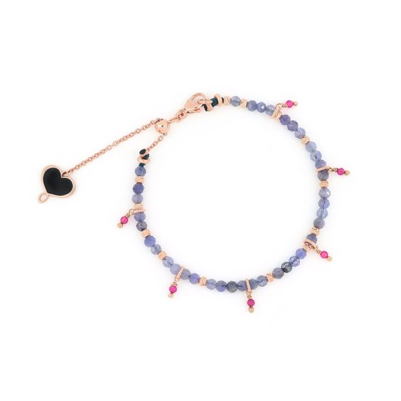 Bracciale azzurro con pietre di Tanzanite e gocce di Rubellite rosa pendenti realizzato in argento 925 con galvanica oro rosa ad alto spessore e resistenza. Il bracciale può essere regolato da un minimo di 13 cm fino ad un massimo di 19 cm grazie alla sfera scorrevole. Cuore Maman smaltato di nero. Chiusura a moschettone.