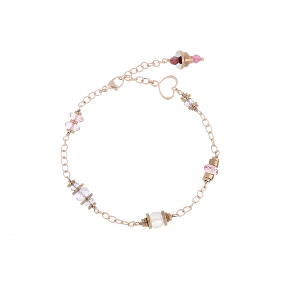 Bracciale realizzato in argento 925 con galvanica oro rosa ad alto spessore e resistenza catena e pietre di Ametista viola, Topazio rosa, Tormalina rosa e Quarzo rosa e da sezioni di cilindro di Apatite di diverse dimensioni. Lungo la catena è presente il cuore Maman traforato. Il bracciale può essere regolato fino ad un massimo di 20 cm. Chisura a moschettone.