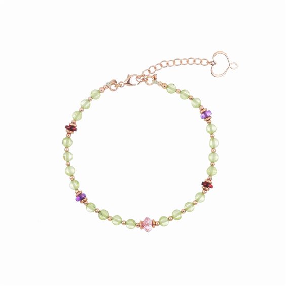 Bracciale realizzato in argento 925 con galvanica oro rosa ad alto spessore e resistenza. Il bracciale presenta piccole sfere decorative e pietre di Peridoto verde, Granato rosso, Ametista viola e Topazio rosa. Il bracciale può essere regolato da un minimo di 17,5 cm fino ad un massimo di 22 cm agganciandolo al cuore Maman traforato. Chiusura a moschettone.