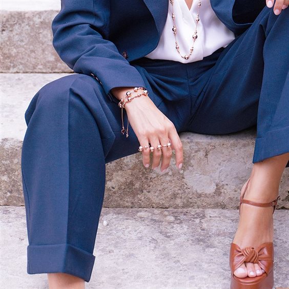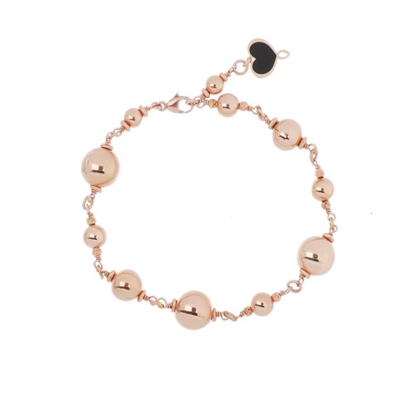 Bracciale realizzato in argento 925 con galvanica oro rosa ad alto spessore e resistenza con sfere mondi di varie dimensioni. I mondi hanno diametri da 5, 6, 8 e 10 mm. Il bracciale può essere regolato fino ad un massimo di 21 cm di diametro. È presente il cuore Maman smaltato di nero ad un'estremità