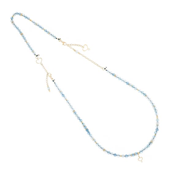 Collana compo doppia con pietre di acquamarina in diverse dimensioni alternate a nodi e sfere decorative realizzata in argento 925 con galvanica oro giallo ad alto spessore e resistenza. La peculiarità di questo oggetto è che può essere indossato in tre modi diversi. Può essere indossato come collana oppure, sganciando i due moschettoni, si ottengono un girocollo e un bracciale. Sono presenti due moschettoni e due cuori Maman. Questo articolo è composto da gcisf4am e da brisf4am che possono essere acquistati separatamente. Chiusura a moschettone.