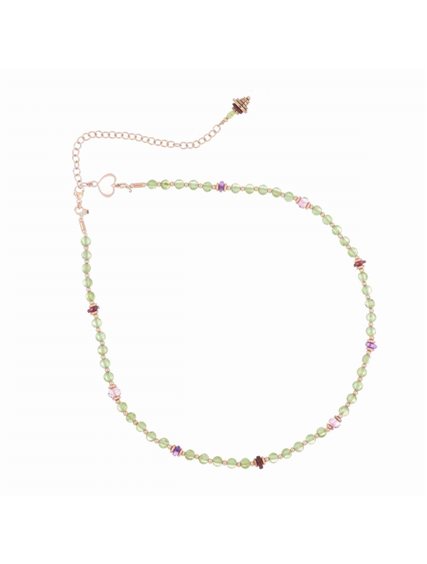 Girocollo realizzato in argento 925 con galvanica oro rosa ad alto spessore e resistenza. Il girocollo presenta piccole sfere decorative e pietre di Peridoto verde, Granato rosso, Ametista viola e Topazio rosa. Il girocollo può essere regolato da un minimo di 36 cm fino ad un massimo di 45 cm. È presente il cuore Maman traforato. Chiusura a moschettone.