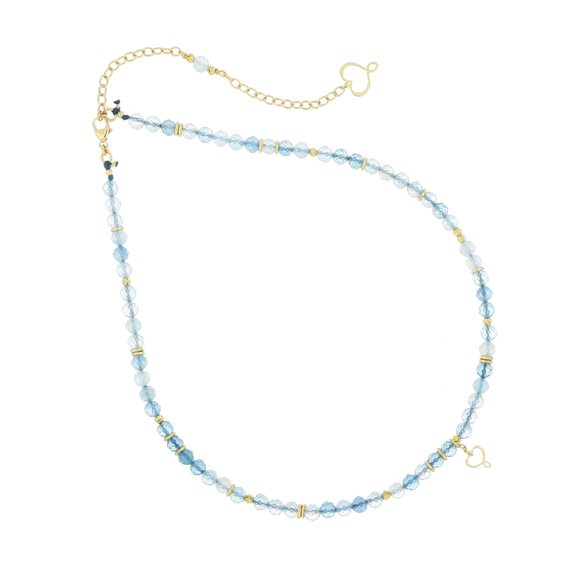 Girocollo in argento 925 con galvanica oro giallo ad alto spessore e ad alta resistenza. Il girocollo è ricoperto per tutta la sua superficie da pietre di acquamarina alternate ad elementi decorativi in argento. Presenta al centro mini cuore maman pendente. Può essere regolato da un minimo di 35 ad un massimo di 44,5 cm. Cuore Maman traforato all'estremità. Chiusura a moschettone.