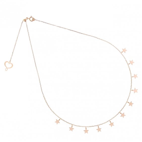 GIROCOLLO AURUM IN ORO ROSA 18 CARATI CON UNDICI STELLE PENDENTI Girocollo Aurum realizzato in oro rosa 18 carati con nove cuori pendenti di 5 mm x 5 mm ciascuno. La circonferenza del girocollo è regolabile grazie alla sfera scorrevole fino ad un massimo di 41 cm. Chiusura con anello a molla.
