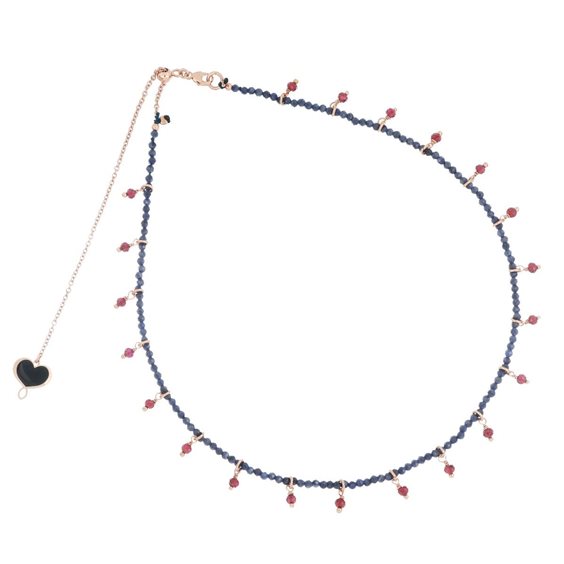Girocollo chocker con pietre di Zaffiro e gocce di Granato pendenti realizzato in argento 925 con galvanica oro rosa ad alto spessore e resistenza. Il girocollo può essere regolato da un minimo di 31 cm fino ad un massimo di 42,5 cm grazie alla piccola sfera scorrevole. Inoltre è presente il cuore Maman smaltato di nero. Chiusura a moschettone