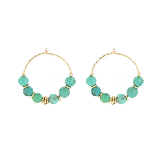 Coppia di orecchini a cerchio con pietre di aulite turchese di dimensione 6mm e sed elementi decorativi in argento. Il cerchio ha un diametro di 25 mm. Gli orecchini sono realizzati in argento 925 con galvanica oro giallo ad alto spessore e resistenza.