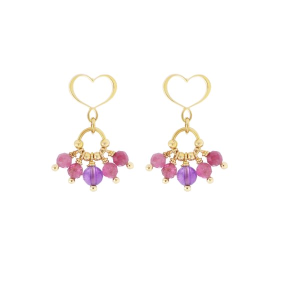 Coppia di orecchini lobo realizzati in argento 925 con galvanica oro giallo ad alto spessore e resistenza. L'orecchino presenta un cuore Maman e pietre di tormalina e ametista. Chiusura a farfallina.