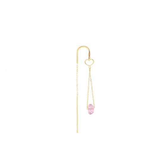 Orecchino ad ago singolo con cuore Maman traforato pendente con doppia catena e goccia di Topazio rosa realizzato in oro giallo 18 carati. Il cuore misura 5 mm x 5 mm. La lunghezza frontale dell'orecchino è di 40 mm.