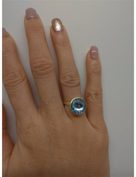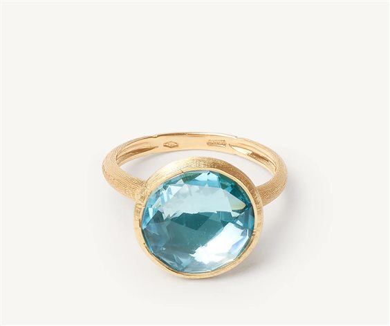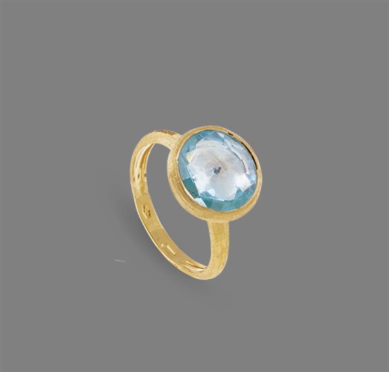Un anello dalle linee essenziali e dal colore acceso. Impreziosito da un topazio azzurro accuratamente selezionato e incastonato in una ghiera in oro giallo 18kt, finemente incisa a mano con l'antica tecnica del bulino millerighe. Perfetto indossato da solo o abbinato alle altre nuance della collezione. MISURA 15
