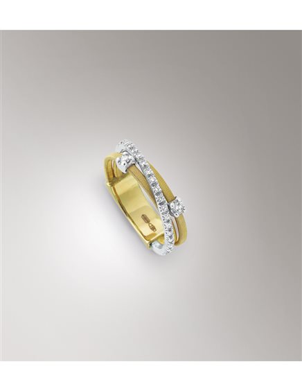 Un elegante anello in oro bianco 18kt: un intreccio di spirale piatta, realizzata grazie all’esclusiva lavorazione artigianale del coil, impreziosito da due diamanti incastonati e da una sofisticata barretta di diamanti taglio brillante.