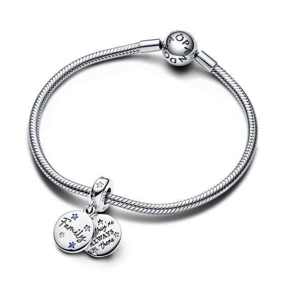 Pendente Doppio Famiglia Argento Sterling 925; 7 zirconia cubica incolore con incastonatura a filo, taglio brillante rotondo; 4 cristalli blu creati in laboratorio, con incastonatura a filo in una forma a stella, taglio brillante rotondo; incisione: "FAMILY" ("famiglia"); "but th