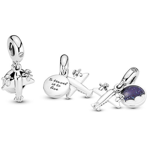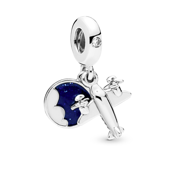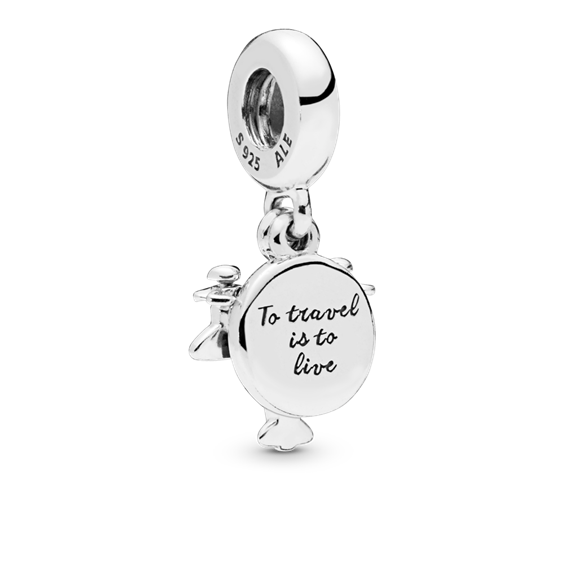 Questo charm, raffigurante un cielo blu dietro un aereo a elica scintillante, è perfetto per chiunque voglia spiccare il volo. Il pendente è rifinito con una singola pietra e inciso sul retro con l'avventurosa frase 'Viaggiare è vivere'.