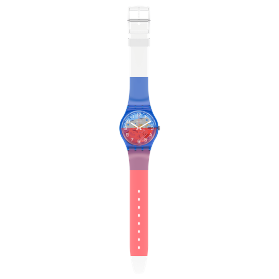 Orologio Solo Tempo Unisex Di Swatch Della Collezione Monthly Drop Della Linea Gent Standard. Cassa In Plastica Di Colore Blu Trasparente E Di Forma Rotonda, Il Diametro Della Cassa È Di 34 Mm E Il Cinturino In Plastica Di Colore Trasparente Con Stampa Multicolore. La Larghezza Delle Anse È Di 16 Mm E La Resistenza All'Acqua È Di 3 Bar. Orologio Di Taglia Unica E Con Movimento Al Quarzo. Il Nome Dell'Orologio È Verre-Toi.