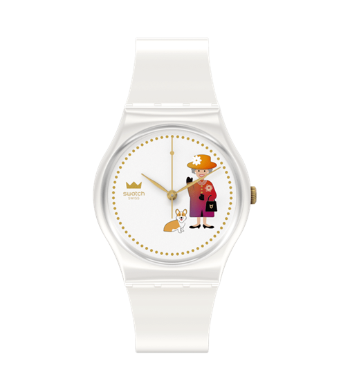 HOW MAJESTIC - Caratterizzato da un quadrante chiaro e da una stampa dorata, questo orologio Gent presenta 70 punti colorati in oro per festeggiare i 70 anni di regno della regina. La peculiarità di questo orologio consiste nel datario che cambia colore e modifica ogni giorno il colore dell'outfit della regina. Questo orologio è abbellito da una robusta cassa e da un cinturino in silicone di colore bianco opaco, con effetto Anodamazing. In questa speciale confezione rivestita è inclusa una sorpresa unica: una scintillante corona di carta di colore argento.