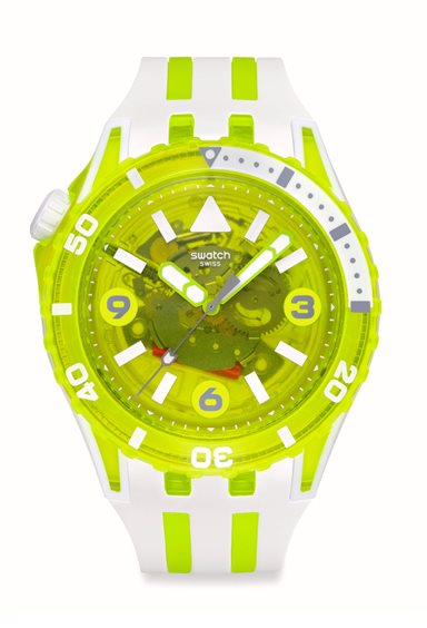Il quadrante giallo trasparente di questo orologio subacqueo presenta indici stampati in bianco, numeri stampati in grigio, lancette delle ore e dei minuti gialle e lancetta dei secondi grigia, che si illuminano al buio, sotto un vetro biosourced. La cassa combina Bioceramic bianco opaco e materiale biosourced giallo trasparente lucido ed è abbinata a una lunetta in materiale biosourced giallo trasparente lucido con stampa grigia e bianca che si illumina al buio e a una corona in Bioceramic bianco opaco a ore 10. Completano l'orologio un cinturino bianco opaco e giallo trasparente opaco con passante bianco opaco e fibbia ad ardiglione in materiale biosourced giallo trasparente lucido.