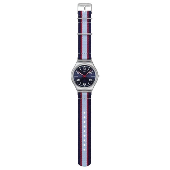 Questo orologio ultrapiatto presenta un quadrante blu scuro con finitura spazzolata soleil, flangia argentata, indici e numeri stampati in bianco, minuteria stampata in blu chiaro e lancette di ore e minuti bordeaux che si illuminanl al buio. La cassa, i passanti e la mezza fibbia in acciaio inossidabile sabbiato sono completati da un cinturino in tessuto a righe blu scuro, bordeaux e azzurro.