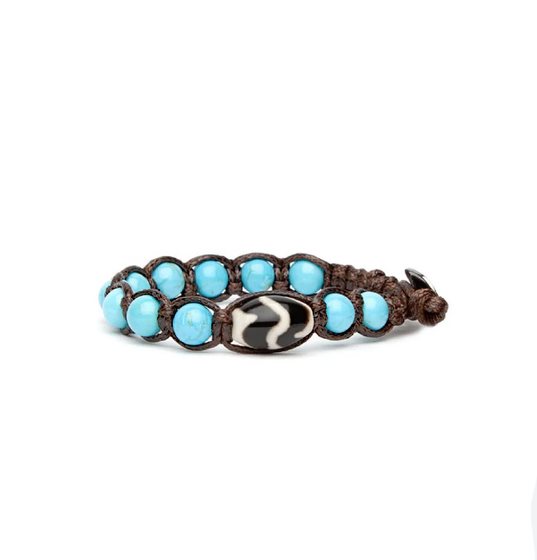 La caratteristica predominante dei bracciali della collezione Shönu è la pietra GZI presente in ognuno di essi. Queste pietre di Onice sono trattate con antiche tecnice manuali per creare disegni e figure simboliche che esprimono concetti semplici e primitivi ma al tempo stesso molto potenti. Ogni simbolo corrisponde ad un significat0 Questa pietra simboleggia la SERENITÀ: in Oriente la serenità acquisisce valore con gli aspetti spirituali, ma senza escludere quelli materiali. Questo simbolo richiama ad un maggior equilibrio tra spirito e corpo ma sopratutto ad una condizione di non tensione, senza preoccupazioni e timori. Il Turchese aiuta a riconoscere le cause alla base degli eventi della propria vita, rafforza il coraggio e la sicurezza di sé.Tamashii Shönu Serenità Turchese BHS501-02-7