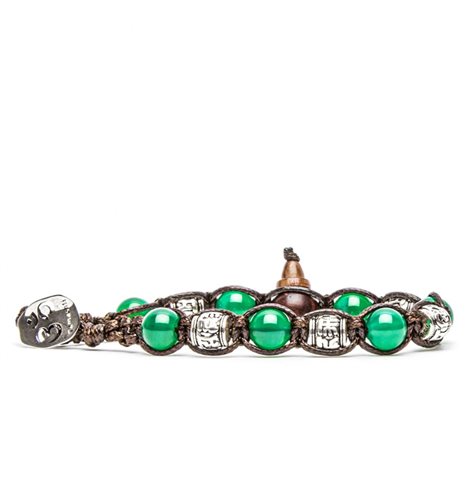 Bracciale originale Tamashii 'Ruota della preghiera' realizzato con pietre naturali AGATA VERDE. Il bracciale è arricchito da ruote in argento 925‰ (a barilotto o a sfera) incise con il mantra “Om Mani Padme Hūm” del Buddha della compassione Cenresig. Unisex e taglia unica (il bracciale è predisposto per adattarsi a qualsiasi diametro di polso).
