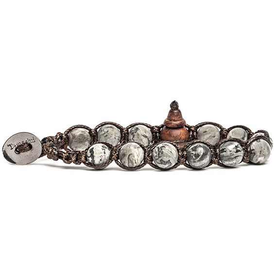 In Tibet i gioielli hanno un forte valore simbolico e tramandano valori culturali e religiosi antichissimi. Nella tradizione buddhista le gemme e i gioielli servono come metafore per gli ideali della fede ed esprimono misteriose condizioni spirituali e attributi interiori nascosti. Tamashii (o Shamballa) è un bracciale utilizzato dai monaci tibetani per favorire la meditazione, per le pratiche religiose e come talismano. Infatti Tamashii significa “anima” e il termine deriva da 'tama' che significa “gioiello”, quindi “gioiello dell’anima”. Chi lo indossa persegue un ideale di pace e di amore verso se stesso e verso il mondo, il bracciale aiuta a proteggere la sua anima, a farla crescere e farle trovare un ruolo ed un senso all'interno della vita. Prodotto realizzato in Tibet e benedetto da monaci buddisti. Ogni bracciale è spedito con relativa confezione originale e certificato di garanzia. Bracciale Tamashii Tradizionale a 1 giro Bracciale tradizionale originale tibetano (Shamballa) realizzato in Tibet con pietre naturali dure, semi-preziose e preziose e benedetto da monaci Buddisti. Ogni bracciale Tamashii è caratterizzato dalla presenza della Calabash (zucca) e dal bottone inciso Tamashii. La diaspro Picasso e` una pietra grigio scuro, arancione o gialla con strisce in genere nere o marroni. E` una pietra associata alla creatività, alla consapevolezza e all'autodisciplina. Aiuta a ricordare i sogni e ci ricorda, anche, che dobbiamo prenderci un momento per godere della vita e delle piccole cose. Bracciale originale tibetano Tamashii realizzato con pietre naturali DIASPRO PICASSO. Unisex e taglia unica (il bracciale è predisposto per adattarsi a qualsiasi diametro di polso). Ogni bracciale è spedito con relativa confezione originale e certificato di garanzia.