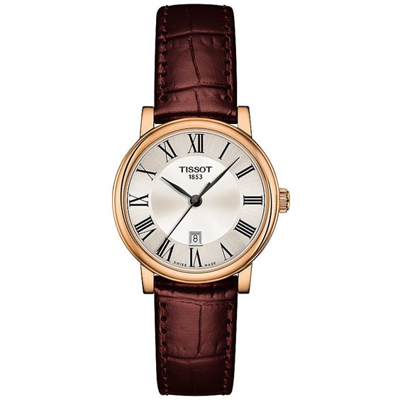 Orologio Solo Tempo Da Donna Di Tissot Della Collezione T-Classic Della Linea Carson. Nome Orologio: Tissot Carson Premium Lady. Orologio Con Cassa In Acciaio 316 L Con Trattamento Pvd Oro Rosa Di Forma Rotondo Di Dimensioni 30Mm Con Spessore Di 6.7Mm E Distanza Tra Le Anse Di 15Mm.Cassa Con Vetro Zaffiro Antigraffio. Il Quadrante È Di Colore Argento Con Numeri Romani. Ill Cinturino È Realizzato In Pelle Di Colore Marrone E Con Fibbia Standard. Orologio Swiss Made Con Movimento Svizzero, Al Quarzo E Alimentazione Quarzo Eol. Modello: Eta F03.115. Batteria:Tipo Renata 364. Funzioni: Eol (Battery End-Of-Life Indicator). Peso: 29 G. Orologio Impermeabile Fino A 5 Bar (50 Metri/165 Piedi). La Referenza È T1222103603300